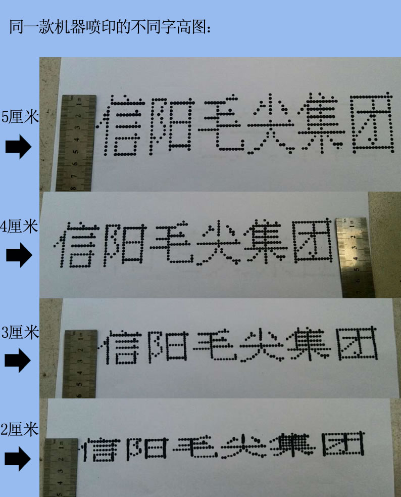 產(chǎn)品特點: 1、體積小巧,機身重2.6Kg,噴頭超輕。 2、字符高度任意調(diào)節(jié)5MM-60MM區(qū)間任意調(diào)節(jié) 3、拼音輸入法,操作方便 4、氣液分離,保證氣泵氣路不被墨水堵塞 5、四輪設(shè)計,可噴平面,弧面,管壁,等任何不規(guī)則面 6、輪距可調(diào),可卡不同粗細管徑的管材 7、4.3寸彩色液晶屏,人性化操作 特殊功能介紹:1、機器特有的高度調(diào)節(jié)功能,噴頭設(shè)計為圓形,所以可以將噴頭調(diào)節(jié)一個角度,然后在主機里設(shè)定一個跟這個角度相對應(yīng)的斜率,通過編碼器給出同步信號,打印出比原字高矮的字符來,值得提出的是改變字符高度的同時不減少噴印的點數(shù),如圖所示: